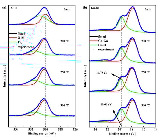 (a) Deconvoluted O 1s XPS profile with VO and O-M, and (b) deconvoluted Ga 3d XPS profile with Ga-Ga and Ga-O in a-IGZO films received different first-annealing treatments at fresh, 200 °C, 250 °C, and 300 °C, respectively.
