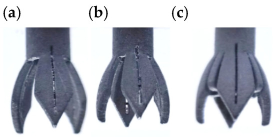 Metallic 3D-printed novel electrospinning nozzle. The outward spreading angles is 35° and the length of the vanes is 11 mm. (a) Nozzle with 3 vanes and without supported structure. (b) Nozzle with 4 vanes and without supported structure. (c) Novel nozzle with 4 vanes and supported structure.