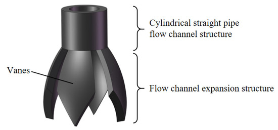 The schematic diagram of the structure of the new electrospinning nozzle. It includes cylindrical straight pipe flow channel structure and flow channel expansion structure.