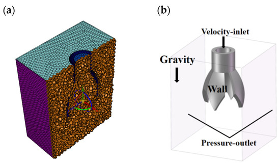 Mesh generation and numerical simulation of the novel nozzle. (a) Cross-section of the novel nozzle mesh (minimum cell size: 0.2 mm, average cell size: 0.95 mm). (b) Numerical simulation model showing the flow field space (20 mm × 20 mm × 25 mm) and boundary conditions (velocity inlet: 1 × 10⁻3 m/s, pressure outlet: 0.1 MPa) used to analyze droplet holding behavior and liquid surface dynamics.