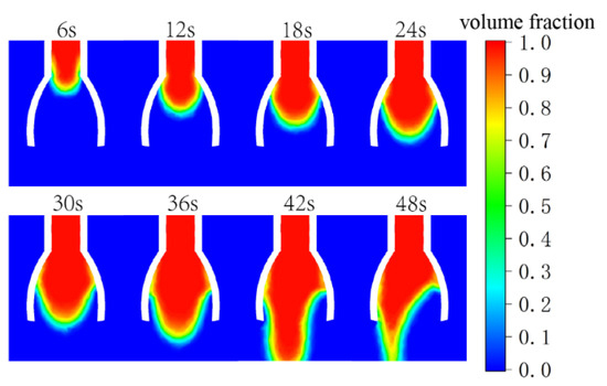 The distribution of fluid volume fraction inside the novel electrospinning nozzle over time. The cloud image illustrates the spreading behavior of the electrospinning solution (10% PAN) along the vanes (opening angle: 35°).