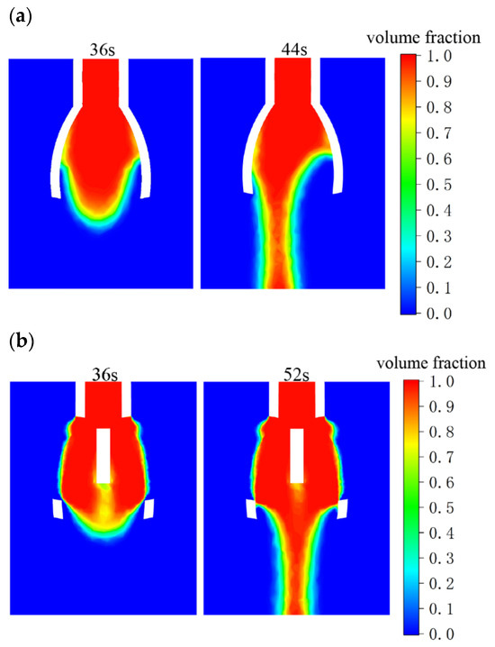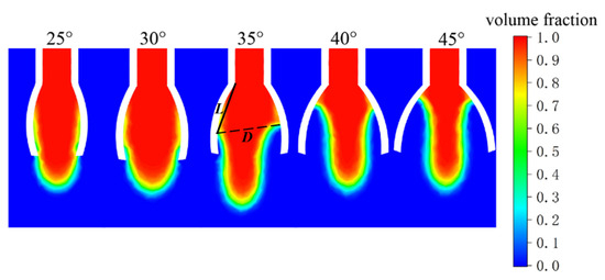 Following the above process, the fluid spreading of the novel nozzles with 25°, 30°, 35°, 40°, and 45° vane opening angles was simulated, and the distribution of the fluid volume fraction at the moment when the fluid is fully spread is shown in Figure 6. Taking the vane opening angle of 35° as an example, the solid straight line L represents the spreading length of the liquid, and the dashed straight line D represents the maximum diameter of the liquid surface. The measured results of the spreading length of the fluid and the maximum liquid surface diameter are listed in Table 2. According to the data in Table 2, the maximum spreading length of the fluid decreases as the opening angle of the novel nozzle vanes increases, with none exceeding 9 mm. Additionally, the maximum diameter of the liquid surface varies with the vane opening angle, showing an initial increase followed by a decrease from 25° to 45°. When the novel nozzle vanes have an opening angle of 35°, the maximum diameter of the liquid surface reaches 8.966 mm. During the electrospinning process, a larger liquid spreading surface inside the nozzle can facilitate the diversion effect of multiple slits. This enables the continuous delivery of the spinning solution to the tips of the vanes, providing a guarantee for improving the efficiency and stability of electrospinning. Therefore, the opening angle of the vanes should be chosen as 35°.