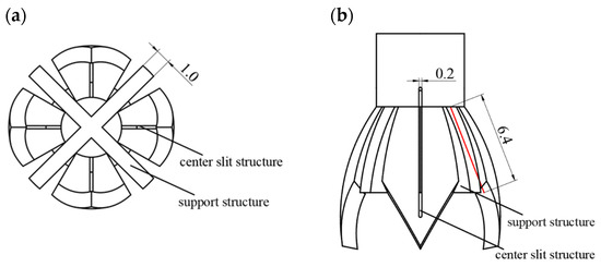 Structural design of the novel electrospinning nozzle with center slit and support structure. (a) Top view showing the radial arrangement of vanes (opening angle: 35°) and the central slit (width: 0.2 mm) for precise liquid diversion. (b) Main view highlighting the support structure (length: 6.4 mm), which increases liquid contact area and enhances droplet holding time. The red line in the figure represents the droplet spreading length when the vane is opened at 35° as shown in Table 2.