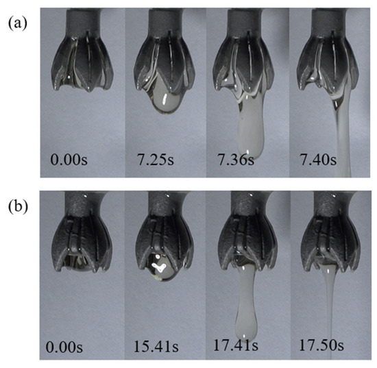 As shown in Figure 9, when the electrospinning solution spreads along the vanes to its limit, droplets begin to form at the center of the liquid surface. This process is relatively slow. As the mass of the droplets increases, they eventually overcome the surface tension of the liquid and fall due to gravity. From the time recorded by the camera, it can be found that the droplet holding time of the novel nozzle without support structure is 7.40 s, and the droplet holding time of the novel nozzle with support structure is 17.50 s. Consistent with the simulation results from the previous section, the support structure significantly impacts droplet holding, effectively enhancing the stability of the electrospinning process.