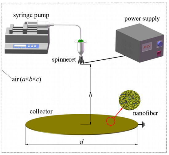 The model of the electrospinning system is established as shown in Figure 10, including the spinning emitter, the fiber receiving the electrode (disk shape), and air [19]. As shown in Figure 10, a, b and c are the length, width, and height of the air cube, with values of 600 mm each. d denotes the diameter of the receiving electrode, which is 300 mm, and h is the distance from the emitter to the receiving electrode, set at 200 mm. During the simulation, a positive voltage of 30 kV is applied to the novel nozzle of the emitter, while the receiving electrode is grounded.