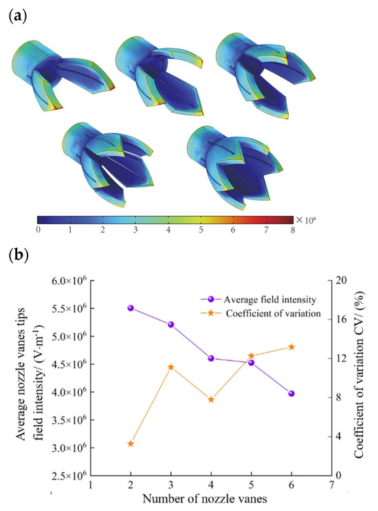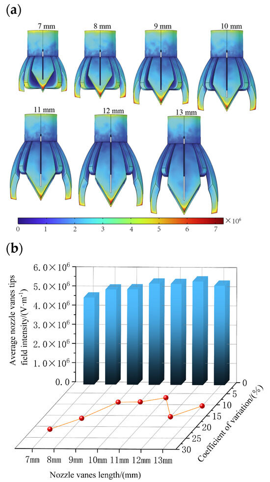 Figure 12a shows the electric field cloud of the novel electrospinning nozzle with different vane lengths, and Figure 12b shows the average value of the electric field intensity with field intensity CV for different vane lengths.