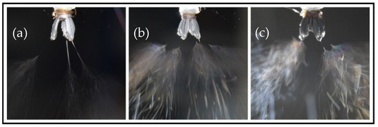 Figure 13 illustrates the electrospinning process for three types of novel nozzles: (a) a 3-vane unsupported structure novel nozzle, (b) a 4-vane unsupported structure novel nozzle, and (c) a 4-vane supported structure novel nozzle (with vanes length of 11 mm). It can be observed that as the electrospinning solution flows through the cylindrical straight pipe flow channel, the center slit diversion causes a uniform distribution of the solution at the tips of each vane. This configuration enables all types of novel nozzles to generate multiple electrospinning jets.
