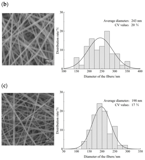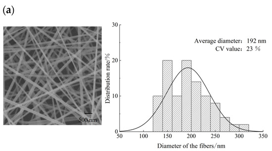 A small section of the sample membrane was cut and placed flat on conductive adhesive after gold sputtering. The surface morphology was then observed using a Hitachi Flex SEM1000 Cold Field Scanning Electron Microscope, Hitachi, Tokyo, Japan. After completing the observations, the diameters of 50 randomly selected fibers from the SEM images were measured using Image Pro Plus 6.0 software. The average fiber diameter and the coefficient of variation (CV) were calculated, and a diameter distribution plot was created.