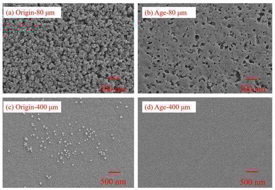 The SEM images clearly showed the surface morphology of PS MPs with particle sizes of 80 and 400 μm before and after thermal activation treatment with K2S2O8 in Figure 1. After thermal activation with K2S2O8, the number of surface folds and cracks in both particle sizes increases significantly. The surface of the aging-80 μm PS MPs became rougher, with cracks, pits, and pores observed compared with the original-80 μm PS MPs. Additionally, compared to the original-400 μm PS MPs (106.07 ± 125.69 nm2) average cracks area, the internal structure of the aging-400 μm PS MPs (141.51 ± 126.73 nm2) was more significant. Xu et al. [19] study found that the surface of aged PS and PE under UV exposure became rough, with the emergence of small holes, cracks, and an increased number of microporous structures. This indicated that the aging process of MPs mainly began with the formation of small pits, pores, and cracks on the surface of the MPs. Moreover, the smaller the particle size, the more pronounced the aging effect.