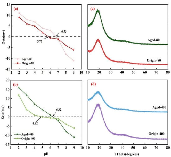 Zeta (a,b) and XRD (c,d) of aging before and after PS MPs with different particle sizes.