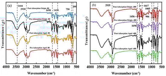 The FTIR spectrum of PS MPs with different particle sizes before and after aging was shown in Figure 2. The original-80 μm PS showed absorption peaks at 3444 and 2920 cm−1, corresponding to the –OH stretching vibration [23] and the asymmetric and symmetric stretching vibrations of the –CH2 group, respectively. Compared to the original-80 μm PS, the aged-80 μm PS showed an increase in the intensity of the absorption peak at 1438 cm−1, indicating stronger C–H stretching vibrations [24]. An enhancement of the absorption peak at 1698 cm−1 was also observed, which was attributed to the stretching vibration of the carbonyl group, suggesting the formation of carbonyl groups during aging due to chain scission and free radical oxidation [25]. The original-400 μm PS and aged-400 μm PS showed absorption peaks at 2935 cm−1, corresponding to the –CH2 group. Absorption peaks related to the external and internal deformations of the benzene ring C–H were observed in the 800–900 cm−1 region. Absorption peaks related to the bending vibration of the benzene ring (C=C) were found at 1456, 1617, and 1696 cm−1. However, the absorption peak intensity of the aged-400 μm PS was significantly higher.