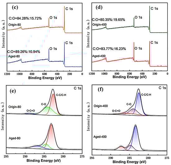 Gaining further insight into the changes in the elemental composition of PS MPs surfaces through XPS analysis was crucial for understanding the modifications in their chemical properties. Figure 3 showed the XPS results of PS MPs with different particle sizes before and after aging. In the full spectrum, both the original- and aged-PS MPs exhibited peaks corresponding to C 1s (278 eV) and O 1s (528 eV), indicating the presence of C and O elements, consistent with their chemical structure. The O/C ratio was an indicator used to evaluate the degree of aging in MPs [29]. The O/C ratio of the aged-80 and 400 μm PS MPs increased by 4.96% and 3.42% compared to the aged-80 and 400 μm PS MPs. The increase in the O/C ratio indicated that more oxygen-containing functional groups were formed on the surface of the MPs during the oxidation process. The O element mainly showed two characteristic peaks in the XPS full spectrum: C–O and O–C=O. For the two different particle sizes of PS MPs, their C 1s spectra showed similar trends after aging. The peak area of O–C=O significantly increased, while the peak area of C–O decreased. These two changes indicated an increase in the number of essential functional groups on the MPs surface and a reduction in alkyl functional groups on the MPs surface. The decrease in alkyl groups might have been related to their consumption during the oxidation process and the subsequent formation of new oxygen-containing functional groups. This suggested that the aging process led to a transformation in the surface chemical structure.