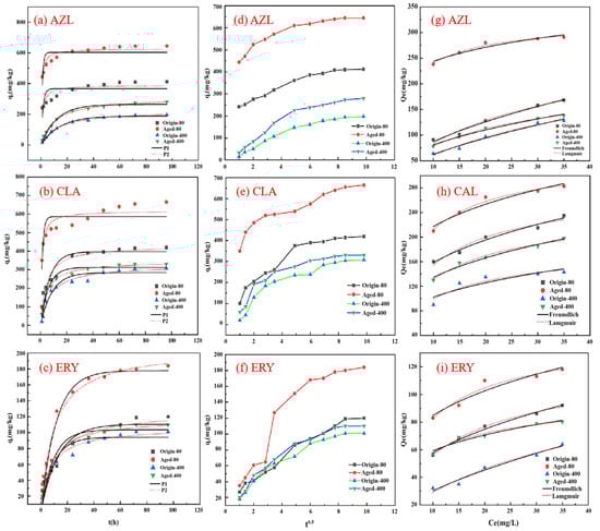 Adsorption kinetics and isotherm models of AZI, CLA, and ERY onto original-PS and aged-PS: (a–c) kinetics; (d–f) Weber–Morris; (g–i) isotherm models.