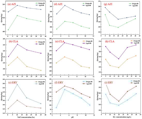 The effect of ionic strength, pH, and HA on AZI, CLA, and ERY adsorption onto original- and aged-PS (80 μm): (a–c) NaCl; (d–f) pH; (g–i) HA.