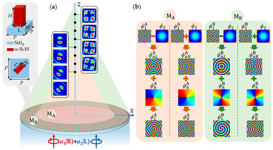 In order to longitudinally manipulate the superimposed optical field, Figure 1b gives the detailed phase design of the transmitted light field at z = 0 for each sub-metasurface by combining the propagation and PB phases. In the phase design of sub-metasurface MA, firstly, the propagation phase is utilized to constructed axicon phase profile with the smaller radial period , with the result that the transmitted light field is deflected to form a long longitudinal depth. Then, the PB phase is used to construct the helical phase profile to generate two orthogonal CP vortices with topological charges of the opposite signs and same absolute value. In addition, the PB phase is used to yield another axicon phase profile with the radial period , and owing to the chirality dependence of the PB phase, the longitudinal depths of two orthogonal CP vortices undergo smaller reverse longitudinal shifts, relative to the position of the original longitudinal depth. By combining the propagation phase and PB phase, the axicon phases of the LCP and RCP vortices can be expressed as and , respectively, where subscript j = A or B, respectively, represent two sub-metasurfaces MA and MB. Therefore, within the longitudinal depth of the two orthogonal CP vortices, the phase difference between the LCP and RCP vortices varies with the propagation distance z. The polarization states of the generated VBs continuously change along the propagation direction, corresponding to the points on the equator of the HOP sphere under LP light illumination. In addition, by changing the polarization state of the incident light, the weights of the LCP and RCP vortices can also be manipulated, and the polarization states of VBs correspond to the points from one pole to the other on the HOP sphere. For the sub-metasurface MB, the topological charge of the helical phase is different from that of sub-metasurface MA. Therefore, based on the different phase design of the two sub-metasurfaces, sub-metasurfaces MA and MB can sequentially generate first- and second-order VBs with longitudinally varying polarization states with the increase in the propagation distance. Therefore, under combined modulation of the axicon and helical phases, as well as the incident light with different elliptical polarization states, it is possible to realize longitudinal manipulation of the polarization states of VBs, corresponding to the points from one pole to the other on different meridians of the nth-order HOP sphere.