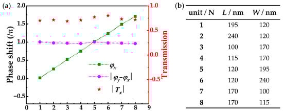 (a) The propagation phase φx, phase retardation |φy − φx|, and the x-direction transmission amplitude Tx versus the sequential number of HWP meta-atoms (N). (b) Dimensions of the eight selected meta-atoms.