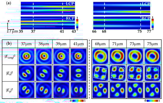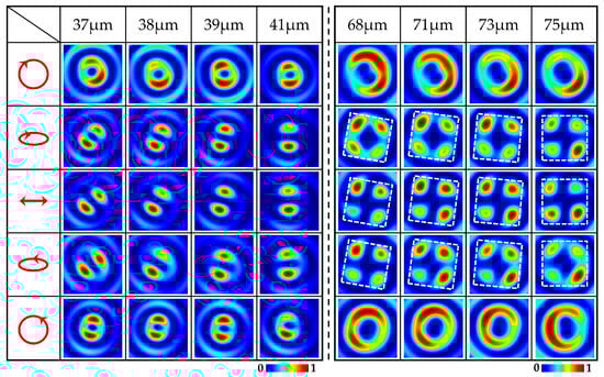 Figure 3a shows the simulation results of LCP and RCP vortices on the x–z plane within the long longitudinal depth under x-LP illumination. According to the figure, the intensity of the LCP and RCP vortices were roughly equal in the range of 37 µm to 41 µm and 68 μm to 75 μm, that is, the weights of LCP and RCP vortices is approximately equal to 1:1, so linearly polarized VBs can be obtained within the longitudinal depth. Figure 3b shows the intensity patterns of total and component fields on the x–y plane at different propagation distances z. The title row represents the position coordinates along the propagation direction, and the rows from top to bottom represent the total intensity patterns and the intensity patterns of the x- and y-components, respectively. Both intensity images of the x- and y-components have the lobes divided by the maximal dark lines, and the dark lines more quantitively express the linear polarization features of the wavefields. The relationship between the number N of lobes and the topological charge l is N = 2l, as can be demonstrated by the two-lobe patterns in the left columns of Figure 3b for l = +1 and the four-lobe patterns in the right columns of Figure 3b for l = +2. We observed that in the range of z from 37 μm to 41 μm, the x- and y-components of the generated VBs had two lobes, and the orientations of the two lobes rotated continuously with distance z, indicating that first-order VBs were generated within the longitudinal depth and the phase difference between the LCP and RCP vortices of VBs varied longitudinally. The polarization states of the generated first-order VBs correspond to the points on the equator of the first-order HOP sphere. Similarly, in the range of z from 68 μm to 75 μm, VBs with four lobes in the x- and y-component intensity patterns were generated, and the orientations of the four lobes also rotated continuously with z, indicating that the second-order VBs were generated in the longitudinal range and the phase difference between the LCP and RCP vortices also varied continuously along the propagation direction. The polarization states of the generated second-order VBs correspond to the points on the equator of the second-order HOP sphere.