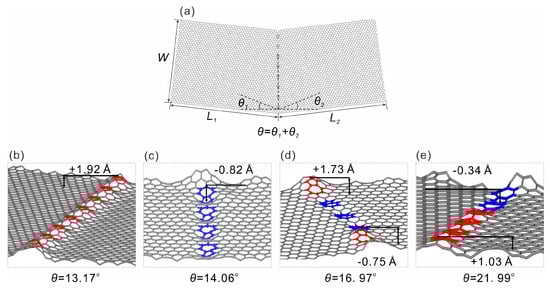 Shown in Figure 1a is a representative atomic model of the type I graphene folding line, where two graphene monolayers with L1 × W and L2 × W in size are tilted at angles of θ1 and θ2; the overall tilt angle is θ = θ1 + θ2. The 5 and 7 membered rings are used to construct the grain boundaries and with an increased tilt angle, it is straightforward to see that the number of 5–7 defects increases, consistent with those reported in the literature [22,30]. Interestingly, with the introduction of defects to the folding line, the graphene structure shows notable out of plane deformation at the defect sites, as can be seen in Figure 1b–e. Although there is no notable monotonic trend of deformation amplitude with increasing defect concentrations (i.e., the grain angle θ), and the deformation direction is random as well, this behavior is, however, encouraging for the folding process. One may expect such defects to lower the bending stiffness as compared to pristine graphene, and moreover, the bending energy will be naturally reduced. For the type II folding line shown in Figure 2, similar behavior was also observed. The major difference here was that the folding line was not a straight line as it costed a higher amount of energy; this finding is consistent with the previous prediction of sinuous grain boundaries made by Zhang et al. [25]. Similar to those observed in the 7–5 grain boundaries, the sinuous defect sites also exhibited out-of-plane deformation in the material. Most of the deformation amplitudes were around 1~2 Å, which shows that the deformation amplitude between the two folding line models was similar.
