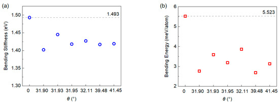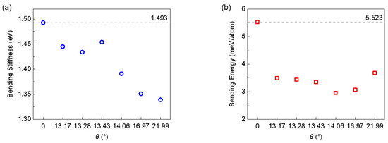 The obtained bending stiffness for both the type I folding line and the type II folding line are summarized, as shown in Figure 4 and Figure 5. Our calculation of the bending stiffness of pristine graphene is 1.493 eV, which is close to the value reported by Wei et al. [18]. When introducing grain boundaries into graphene and bending it along the grain boundary, it is not surprising to see that both the bending stiffness and bending energy of the graphene is substantially reduced. With the bending stiffness reducing from 1.493 eV to about 1.45 eV at a tilt angle of 13.17°~13.43°, upon a further increase of tilt angle up to 21.99°, the bending stiffness continuously decreases to about 1.33 eV. Meanwhile, the bending energy is reduced from 5.523 meV/atom for pristine graphene to about 3.5 meV/atom for graphene grain boundaries, and interestingly, the bending energy does not show strong correlation with the tilt angle of the grain boundary. However, the overall results are supportive of the above mentioned idea that the existence of the grain boundary facilitates the folding of the graphene monolayer. Previous experiments [19,45] showed that for pristine graphene, folding edges are primarily of an armchair or zigzag type, thus the stacking order in the folded bilayer graphene is mainly AA or AB. According to our simulations, because folding along grain boundaries reduces the overall energy required for bending, it is natural to expect that using grain boundaries to guide the folding process—with the introduction of a tilt angle—the resultant stacking order could be of the twisted bilayer graphene type.
