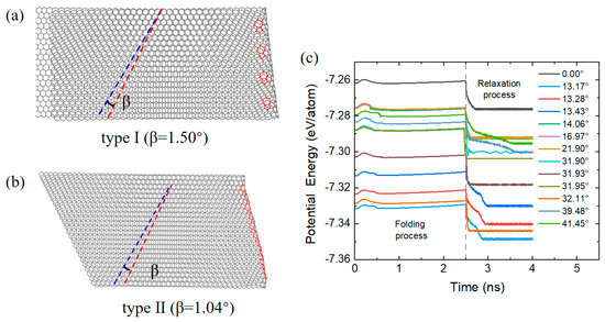 Representative folded bilayer graphene structures with two types of folding line. A twist angle of β = 1.50° (a) is achieved in one of the type I models and β = 1.04° a twist angle is achieved in (b) for the type II model. Potential energy variation during the folding and relaxation process is shown in (c). The tilt angles range from 0 to 41.45° as shown in (c).