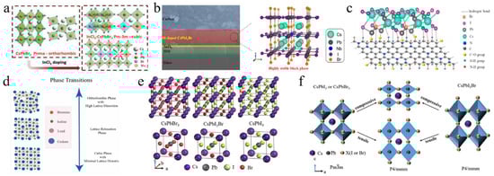 (a) Evolution of the crystal structure and space group of a CsPbBr3 single crystal with an InCl3 dopant. Reproduced with permission [26]. Copyright 2018, Wiley-VCH. (b) Cross-sectional SEM image of the carbon electrode-based CsPbI2Br perovskite device and the schematic illustration of Nb5+ replacing Pb2+. Reproduced with permission [76]. Copyright 2019, American Chemical Society. (c) Schematic illustration of the interaction between N-GQDs and CsPbI2Br film. Reproduced with permission [80]. Copyright 2023, Elsevier. (d) The lattice relaxation for the various phases observed with temperature increments. Reproduced with permission [90]. Copyright 2024, Elsevier. (e) The crystal structure of CsPbI3−xBrx. (f) Schematic illustration of the generation of tensile and compressive strains within a perovskite film. (e,f) Reproduced with permission [91]. Copyright 2024, American Institute of Physics.
