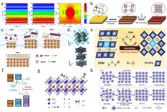 Halide-based additives: Phenylethylamine iodide (PEAI) was incorporated into perovskite precursors as an additive to modulate the crystallization process (Figure 5b) [102]. The introduction of PEAI facilitated the formation of a PbX2-DMSO:DMF-PEAI-CsI intermediate phase, which effectively decelerated crystal growth. This phenomenon promoted Ostwald ripening, resulting in the formation of larger grains with reduced voids. Using this method, a CsPbI2Br device achieved a PCE of 17.40%. Guanidinium iodide (GAI), as a volatile additive, and phenyltrimethylammonium chloride (PTACl), as a passivation agent, were developed to effectively increase the size of perovskite crystals [103]. GAI interacted with Cs+ and GA+ ions through a cation-exchange process, which delayed the reaction between cations and anions. During the annealing process, GAI was completely sublimed. Simultaneously, chloride ions from PTACl were incorporated into the CsPbI2Br lattice, creating a hydrophobic surface that effectively reduced moisture-related degradation. This optimization resulted in a Voc of 1.34 V and a PCE of 16.88% for CsPbI2Br devices. A 2D CsPb2I4Br layer was successfully constructed by adding excess PbI2, which was integrated into the 3D CsPbI2Br perovskite framework, forming a fully inorganic 2D/3D CsPb2I4Br/CsPbI2Br bulk heterojunction (BHJ) (Figure 5c,d) [104]. In this structure, Pb2+ ions were placed at the center of the [Pb2X5]− layer, whereas X− ions mainly constituted the surface. This chloride-rich surface effectively passivated iodine vacancy defects in CsPbI2Br, significantly reducing non-radiative recombination losses. As a result, the Voc and PCE of the PSCs were enhanced to 1.32 V and 15.25%, respectively. Erbium-doped (ErCl3) CsPbI2Br perovskites were synthesized with propylammonium bromide (PABr) as an additive (Figure 5e) [105]. The incorporation of PABr effectively retarded the crystallization process, thereby promoting the formation of micron-sized crystals. Moreover, Er3+ ions partially substituted Pb2+ sites, leading to lattice contraction within the perovskite structure. The addition of PABr significantly enhanced surface morphology, improved crystallinity, and reduced the defect density in the films. As a result, the CsPbI2Br device exhibited superior long-term stability and achieved a PCE of 16.74%. These additives played crucial roles in regulating crystal growth, promoting the formation of larger grains with reduced voids, and enhancing crystallinity.