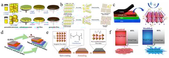 A dual-functional strategy incorporating CsPbBr3 nanocrystals (NCs) was employed to passivate bulk and surface defects within the CsPbI2Br layer (Figure 10b) [100]. The introduction of CsPbBr3 NCs facilitated the formation of an “electronic bridge”, which enhanced electron transport efficiency. Furthermore, the CsPbBr3 NCs modified the surface, establishing a gradient heterojunction between the CsPbI2Br and P3HT layers. Consequently, this approach led to a significant enhancement in the PCE of CsPbI2Br PSCs, achieving a PCE of 17.03%.