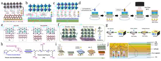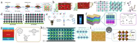 Liquid-type additives: First of all, various liquid-type additives have been introduced into several studies. For example, small carbon chain molecules (diiodomethane (DIM), dibromoethane (DBM), and dichloromethane (DCM)) were employed as liquid additives in the perovskite precursor solution [98]. Among these, DIM exhibited superior performance by effectively passivating uncoordinated Pb2+ ions, promoting oriented crystal growth, suppressing halide ion vacancies, and mitigating surface defects. Consequently, this approach resulted in a CsPbI2Br PSC achieving a PCE of 16.42%. In a similar approach, butyl-3-methylimidazolium tetrafluoroborate (BMIMBF4), an ionic liquid, was utilized as an additive in the perovskite precursor solution [99]. The BMIM+ and BF4− ions coordinated with uncoordinated Pb2+ and I− ions, helping to reduce defect density and allowing excitons to predominantly exist as free carriers. Additionally, these ions stabilized the structure by preventing the tilting of the [PbI6]4− octahedra and enhanced moisture resistance through the incorporation of superhydrophobic fluorine groups, ultimately improving the film’s performance.