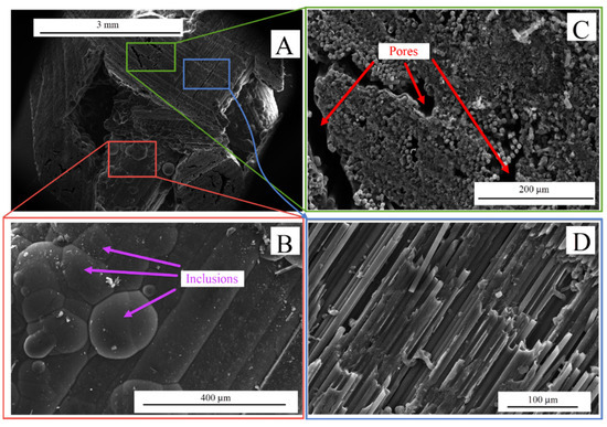 SEM images of C-C composite substrate captured at varied magnifications: (A) ×65; (B) ×800; (C) ×500; (D) ×1000.