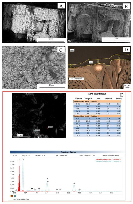 For the coatings obtained by electrophoretic deposition, the formation of flake-like Ca-P structures without a tight adhesion to the carbon substrate was observed (Figure 3A). The presence of numerous pores in the coating with numerous failures (Figure 3B) was found. The adhesion was not continuous (Figure 3C), unlike the coating obtained by detonation spraying when penetration of Ca-P into internal pores and cracks was visualized (Figure 3D). As in the previous case of detonation spraying, the same elements were detected in the coatings as presented in Figure 3E. However, the stoichiometric ratio Ca/P was different and was Ca/P ≈ 1.72–1.86. The coating roughness was close to the substrate roughness (Ra = 1.56 ± 0.23 μm) due to the rather weak adhesive strength of the coatings and the relatively random coating distribution over the substrate.