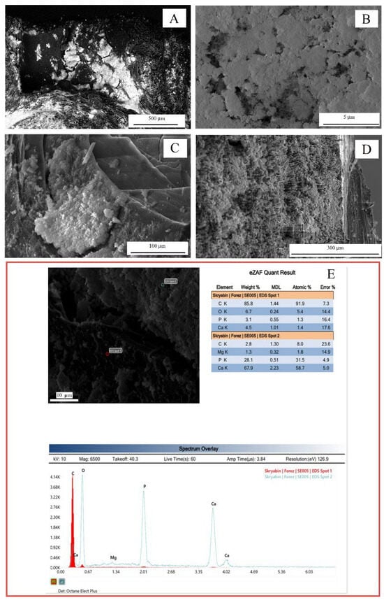 Ca-P coatings on C-C composite (electrophoretic deposition): (A–D) SEM images; (E) EDX data in indicated spots.