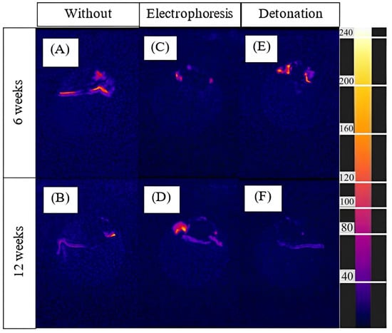 Pseudocolored mapping of T1w-TI MR-images (TI prepulse = 100 ms) of the C-C composites: (A) uncoated, 6 weeks; (B) uncoated, 12 weeks; (C) Ca-P coated (electrophoretic deposition), 6 weeks; (D) Ca-P coated (electrophoretic deposition), 12 weeks; (E) Ca-P coated (detonation spraying), 6 weeks; (F) Ca-P coated (detonation spraying), 12 weeks. Fire color filter (Image J/Fiji).