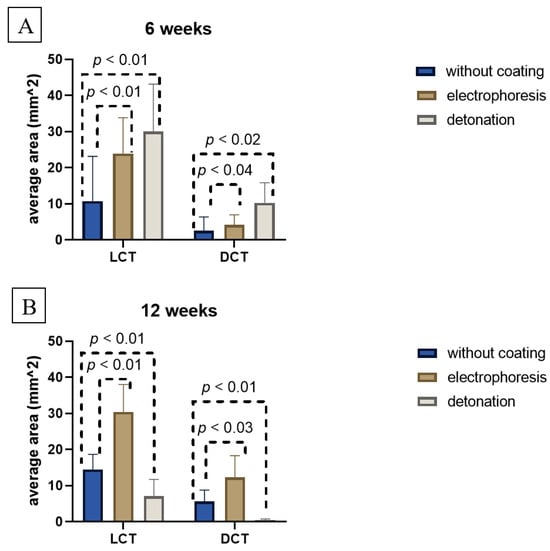 Averaged area of loose (LCT) and dense (DCT) connective tissue of fibrous capsule in autopsy samples taken at 6-week (A) and 12-week (B) post-implantation, with different coatings (uncoated, electrophoretic deposition, detonation spraying) (4 mice per group, number of all analyzed sections N = 18–21). p value < 0.05 is statistically significant for differentiation of loose and dense connective tissue in all samples.