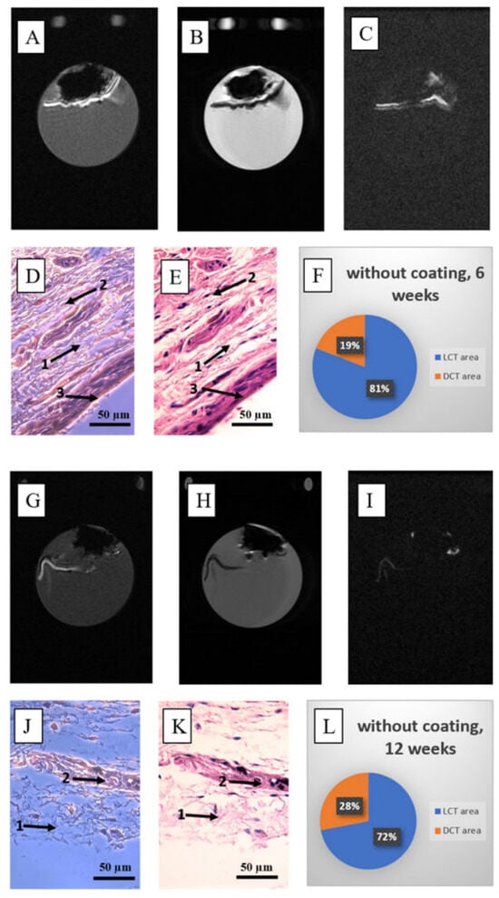The features of the fibrous capsule for uncoated C-C composites (control) at 6 weeks (A–F) and 12 weeks (G–K) post-implantation are as follows: (A,G) T1-weighted (T1w) MR image of the central section; (B,H) T2-weighted (T2w) MR image of the central section; (C,I) T1w-TI MR image of the central section; (D,E,J,K) hematoxylin and eosin staining of the post-implantation autopsy sample (magnification ×400), where 1 = loose tissue, 2 = dense tissue with fragments of C-C composites, 3 = site of tissue contacts with the implant; (F,L) diagram representing the ratio of loose connective tissue (LCT) to dense connective tissue (DCT) for the entire autopsy sample (number of slices N = 18–21).