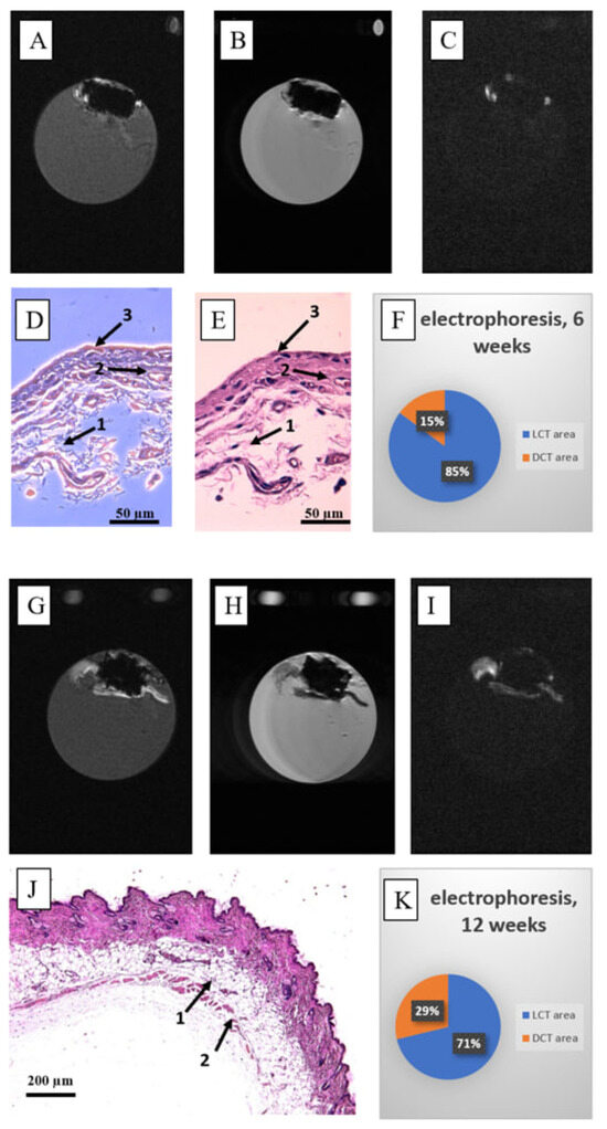 The features of the fibrous capsule for C-C composites coated with Ca-P via electrophoretic deposition at 6 weeks (A–F) and 12 weeks (G–K) post-implantation are as follows: (A,G) T1-weighted (T1w) MR image of the central section; (B,H) T2-weighted (T2w) MR image of the central section; (C,I) T1w-TI MR image of the central section; (D,E,J) hematoxylin and eosin staining of the post-implantation autopsy sample (magnification ×400), where 1 = loose tissue, 2 = dense tissue, 3 = site of tissue contacts with the implant; (F,K) diagram representing the ratio of loose connective tissue (LCT) to dense connective tissue (DCT) for the entire autopsy sample (number of slices N = 18–21).