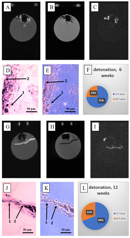 The features of the fibrous capsule surrounding C-C composites coated with Ca-P via detonation spraying at 6 weeks (A–F) and 12 weeks (G–K) post-implantation are as follows: (A,G) T1-weighted (T1w) MR image of the central section; (B,H) T2-weighted (T2w) MR image of the central section; (C,I) T1w-TI MR image of the central section; (D,E,J,K) hematoxylin and eosin staining of the post-implantation autopsy sample (magnification ×400), where 1 = loose tissue, 2 = dense tissue with fragments of C-C composites; (F,L) diagram illustrating the ratio of loose connective tissue (LCT) and dense connective tissue (DCT) for the entire autopsy sample (namber of slices N = 18–21).