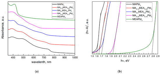 Figure 2a displays the perovskite film’s absorption spectra. The absorption edge of MAxMEA1−xPbI3 shifts towards shorter wavelengths (blue shift) as the MEA fraction increases, indicating an increase in the bandgap energy (Figure 2b).