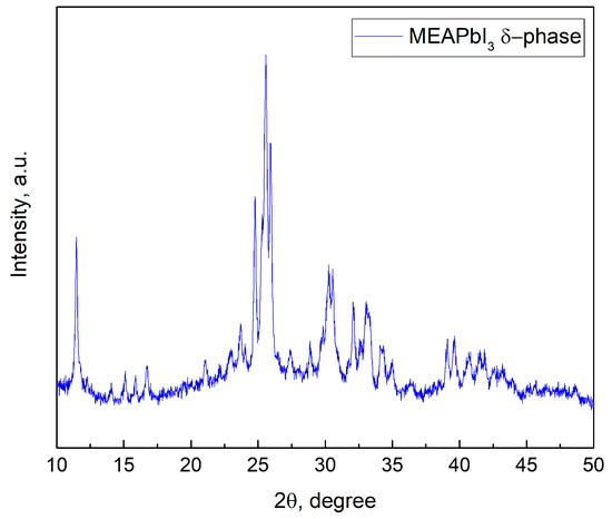 Analysis of the absorption spectra indicates a notable shift in the absorption edge of MEAPbI3 relative to the MAxMEA1−xPbI3 samples, with an optical bandgap of ~2.77 eV. This value exceeds the bandgap energies of both the two-dimensional perovskite MEA2PbI4 and PbI2 [41,58]. As depicted in Figure 3, the MEAPbI3 film displayed a distinct yellow coloration. Additionally, the XRD patterns (Figure 4) suggest the formation of a non-perovskite phase, indicating that MEAPbI3 does not crystallize into the conventional perovskite structure under these conditions.