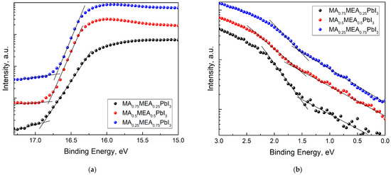 For MA0.75MEA0.25PbI3, MA0.5MEA0.5PbI3, and MA0.25MEA0.75PbI3 organic–inorganic perovskites, the cutoff values for the high binding energy (Ecutoff) and the initial binding energy (Eonset) were determined (Figure 5). With the irradiation energy of 21.21 eV subtracted from Ecutoff, the work functions (Fermi level EF relative to vacuum) for the perovskites were A(MA0.75MEA0.25PbI3) = 4.33 eV, A(MA0.5MEA0.5PbI3) = 4.40 eV, and A(MA0.25MEA0.75PbI3) = 4.51 eV, respectively. To determine the value of the valence band maximum (VBM) relative to vacuum, the value of the initial binding energy (Eonset) was added to the work function A, that is, the following formula was used: