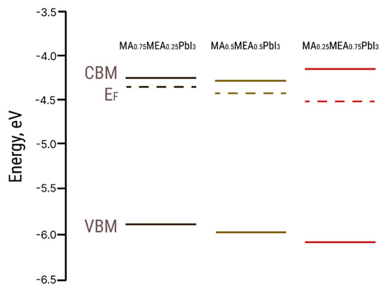 Energy level diagrams for MA0.75MEA0.25PbI3, MA0.5MEA0.5PbI3, and MA0.25MEA0.75PbI3 hybrid perovskites (CBM—conduction band minimum, VBM—valence band maximum, EF—Fermi level).