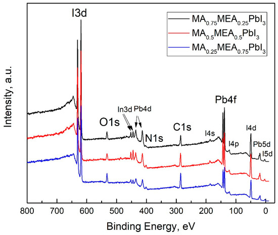 Survey XPS spectra of thin films of MA0.75MEA0.25PbI3, MA0.5MEA0.5PbI3, and MA0.25MEA0.75PbI3 deposited on ITO-coated substrates.
