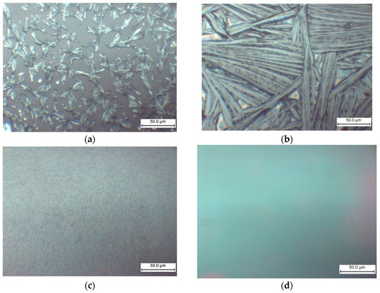 Optical microscopy images of MAxMEA1−xPbI3 films obtained by one-step centrifugation from a solution of DMF and DMSO (1:4) on glass substrates: (a) MAPbI3; (b) MA0.75MEA0.25PbI3; (c) MA0.5MEA0.5PbI3; (d) MA0.25MEA0.75PbI3.