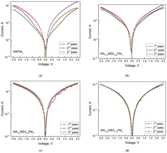 IVs in dark with three measurement passes for MAxMEA1−xPbI3: (a) MAPbI3, (b) MA0.75MEA0.25PbI3, (c) MA0.5MEA0.5PbI3, (d) MA0.25MEA0.75PbI3. The number of passes is indicated by a number in the figure.