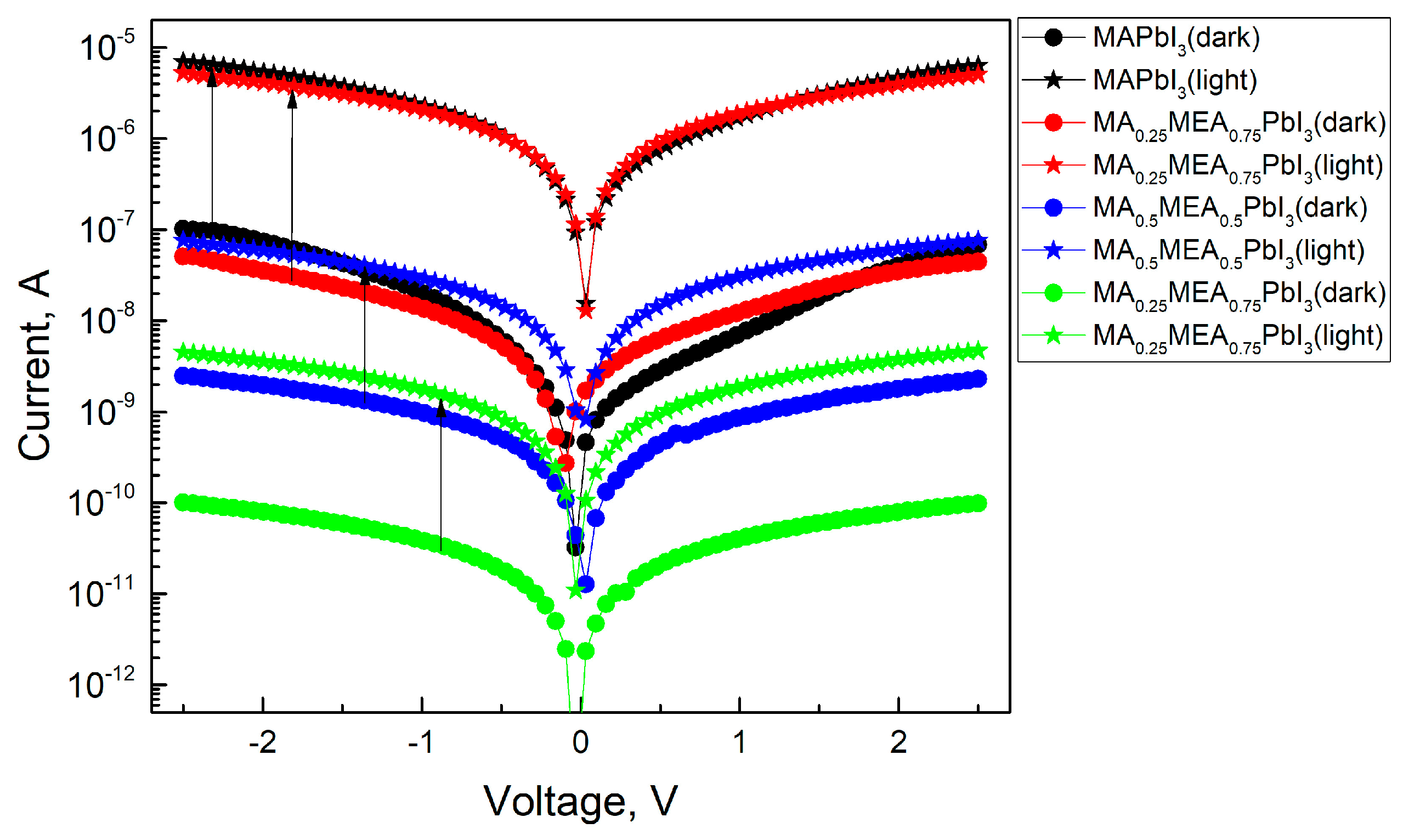 As the MEA fraction increases, the hysteresis (difference in current values under forward and reverse voltage sweeps) decreases. The hysteresis in IV characteristics of hybrid perovskites arises from ion migration [71,72]. Thus, the reduced IV hysteresis in MAxMEA1−xPbI3 suggests improved stability in solar cells and photodetectors. IV measurements under green LED irradiation (Figure 12) reveal that all MAxMEA1−xPbI3 polycrystalline layers demonstrate strong photoresponse.