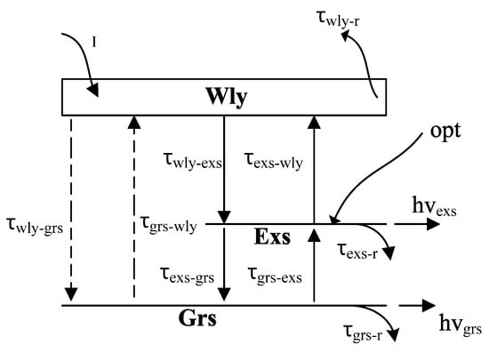 The Q-Dot model investigated here is based on the model explained in references [,,,,]. The rate equations for the carriers and photons in the Grs and Exs of the Q-Dot laser were used as the basis for the direct-relaxation model (DRM) and the cascade-relaxation model (CRM). The Runge–Kutta method—a numerical integration technique commonly used for solving differential equations—was applied to numerically solve the single-mode laser rate equations. Several simplifying assumptions were made in the calculations, including neglecting the Q-Dot size fluctuations and line broadenings, the temperature effects, and the carrier loss. Applying an optical beam to the excited state allows immediate injection of carriers into the excited state, thus reducing the effect of the barrier or wetting layer. The dynamics of carriers were not taken into consideration in the barrier; direct carrier injection from the contacts to the Wly was assumed. Further, only a single discrete Grs and corresponding holes formed inside the Q-Dot were assumed, maintaining charge neutrality within each Q-Dot. Carrier and spontaneous fluctuations included in the laser rate equations were assumed as Langevin noise sources. To investigate the noise effect, facilitate control, and ensure the accuracy of the RIN analysis, a different method was used to include the noises in the differential rate equations [,]. To remove the cross correlations between the carrier and photon noises, new rate equations were defined, and an independent simulation using white Gaussian random variables was allowed. This approach simplifies the addition and control of noise sources. The carrier noise terms added to the Wly, Exs, and Grs equations are denoted as FW, FE, and FG, respectively. The photon noises in the Exs and Grs are denoted as FSE and FSG.