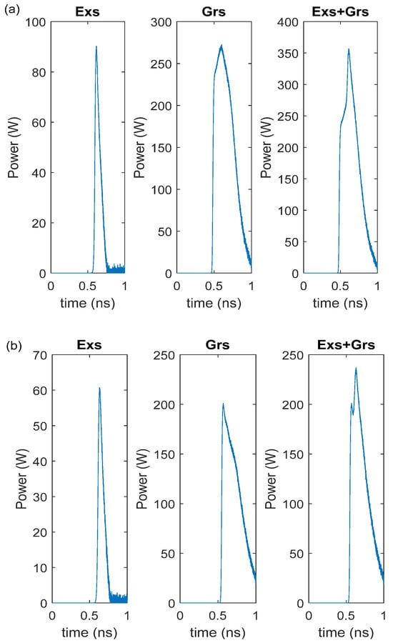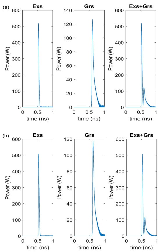 Figure 2 shows the RIN of the curves of the Exs, Grs, and Exs + Grs as a function of the applied current. The Grs + Exs represents the simultaneous emission from both Grs and Exs. It is seen that the curves related to the DRM and CRM spectra almost coincide. When the injected current amplitude is higher than the threshold current of the Grs, the RIN drops with an increase in the current for the Exs, and it remains approximately constant for the Grs and Exs + Grs. Therefore, the gain-switched pulses are produced at all currents for the Grs, whereas the pulses are generated at only low values of RIN for the Exs. The decrease in RIN with the increase in the current was also observed in [,]. As seen in Figure 2, since the peak power value of the DRM is greater than the CRM, as the current increases, the DRM has an approximately 2 dB lower RIN than the CRM. Because of the dominant Grs emission over the Exs emission, as seen in Figure 3, the pulse width of the generated pulses is wide (see Table 3) due to the Grs photons having long pulse widths [,,].