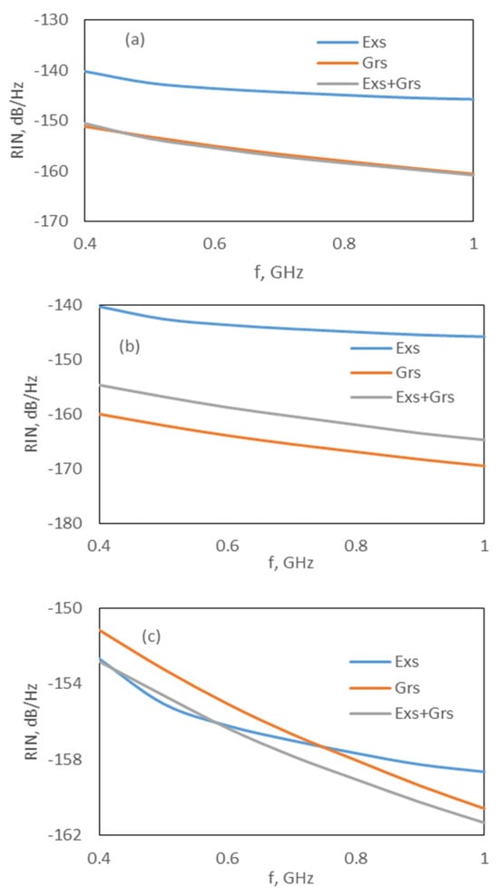 RIN spectrum at 1.6 × Ith,Exs for the DRM: (a) all noises are included, (b) without FG and (c) without FE.