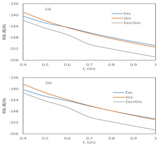 - Slow capture and fast relaxation (): To ensure this, the phonon and Auger terms Awly and Cwly were taken as 0.7 × 1010 s−1 and 2 × 10−9 cm−3s−1, respectively. For both models, in this case, the Exs and Grs threshold currents increased; however, as the increase in the Exs was higher, while the increase in the Grs was very small, there was no change in the RIN spectra of the Grs and Exs + Gr, while the RIN of the Exs value increased, as observed in Figure 8a,b. Gain-switched pulses from the Exs radiation could not be generated at any frequency.