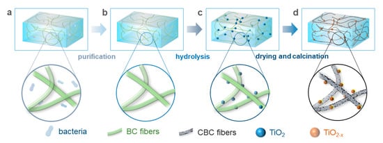 In situ synthesis of 3D structured TiO2−x/CBC containing four states of (a) natural BC membranes, (b) purified BC membranes, (c) TiO2/BC after hydrolysis, and (d) TiO2−x/CBC after drying and calcination.