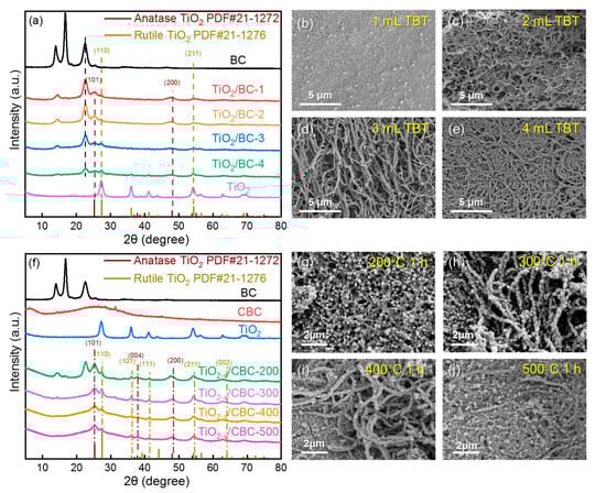 (a) XRD patterns and (b–e) SEM images of TiO2/BC with various TBT concentrations; (f) XRD patterns and (g–j) SEM images of TiO2−x/CBC under different calcination temperatures (Tc).